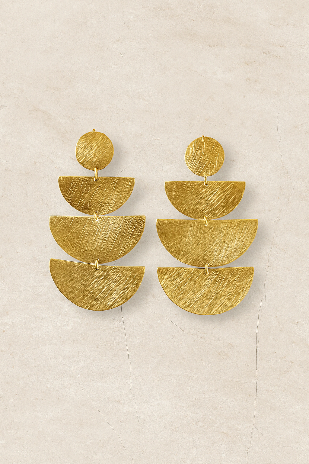 Estos elegantes pendientes hechos a mano en latón con baño de oro de 18 quilates presentan un diseño en capas que combina un círculo superior con tres medios círculos dispuestos en caída. Cada pieza está unida de forma articulada, creando un efecto de movimiento suave y armonioso.
