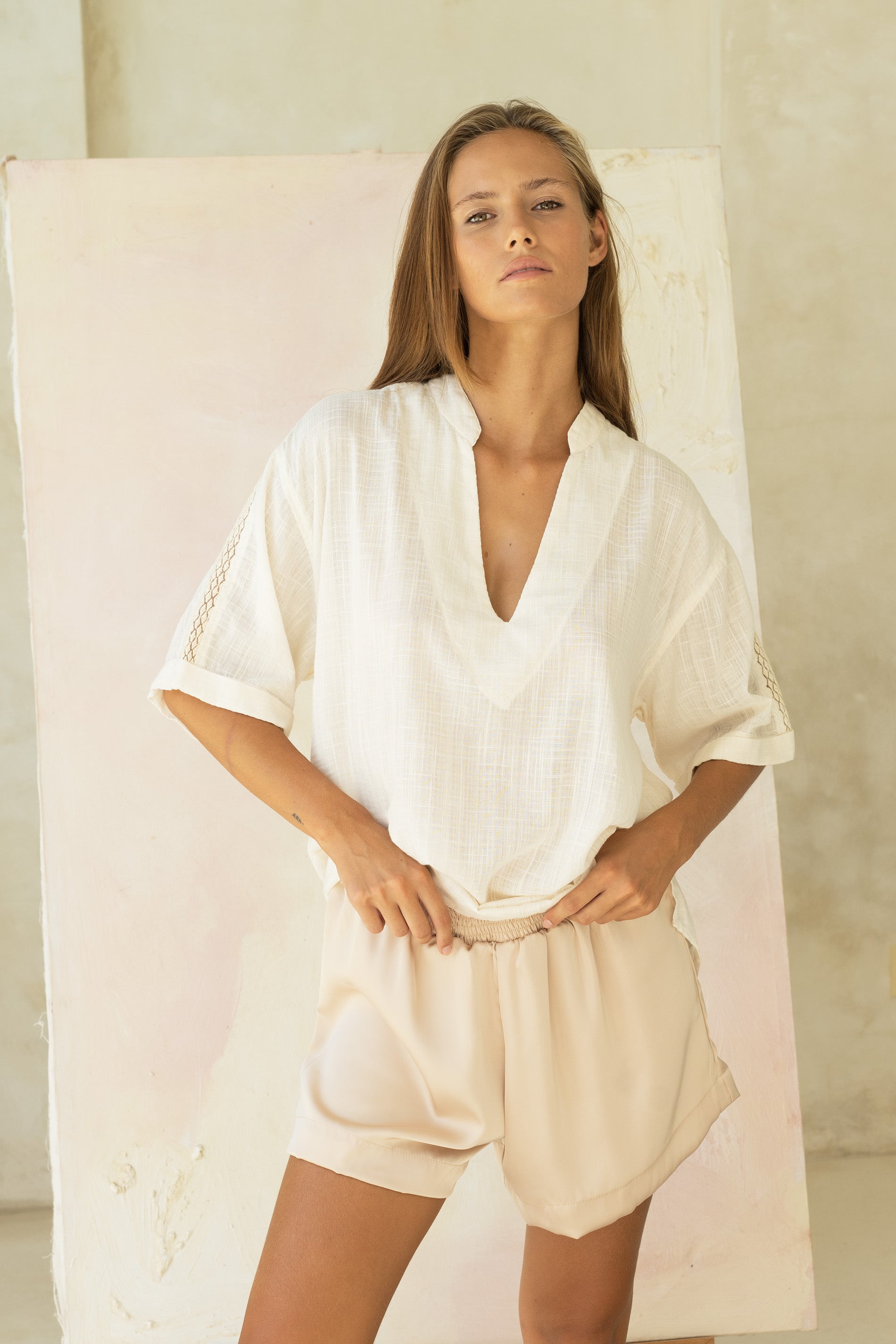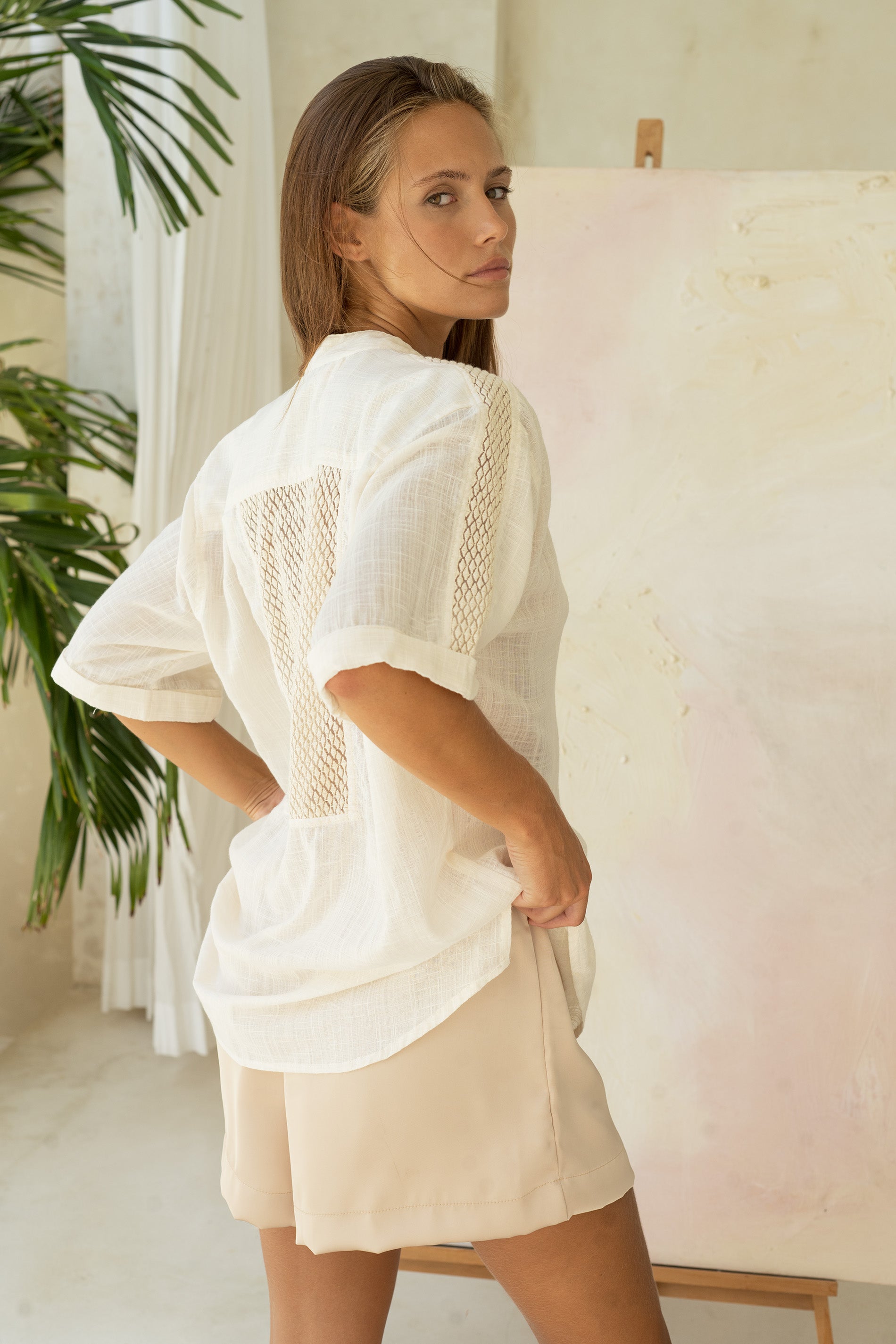 Explora la frescura con nuestra camisa de manga corta, destacada por un escote en forma de pico y confeccionada en algodón con textura en un tono beige. Los detalles de tejido bordado en la parte posterior y mangas añaden un toque distintivo a esta prenda. Disponible en talla única, esta camisa fusiona la comodidad del algodón con un toque de elegancia gracias a los detalles bordados, ofreciéndote un estilo versátil y distintivo.