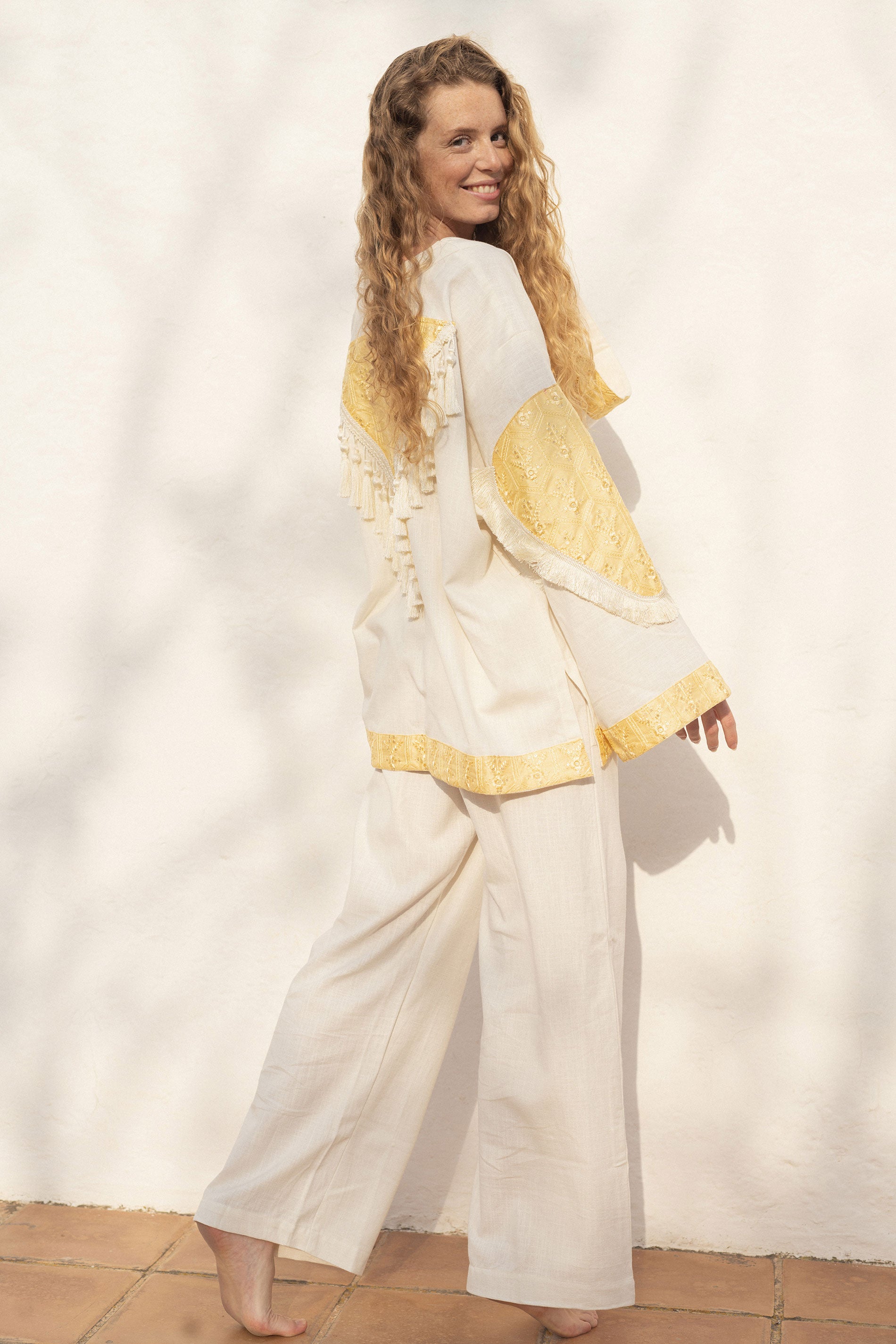 Kimono con Mangas y Cuello Cruzado Bajo. Fabricada en algodón 100% natural.