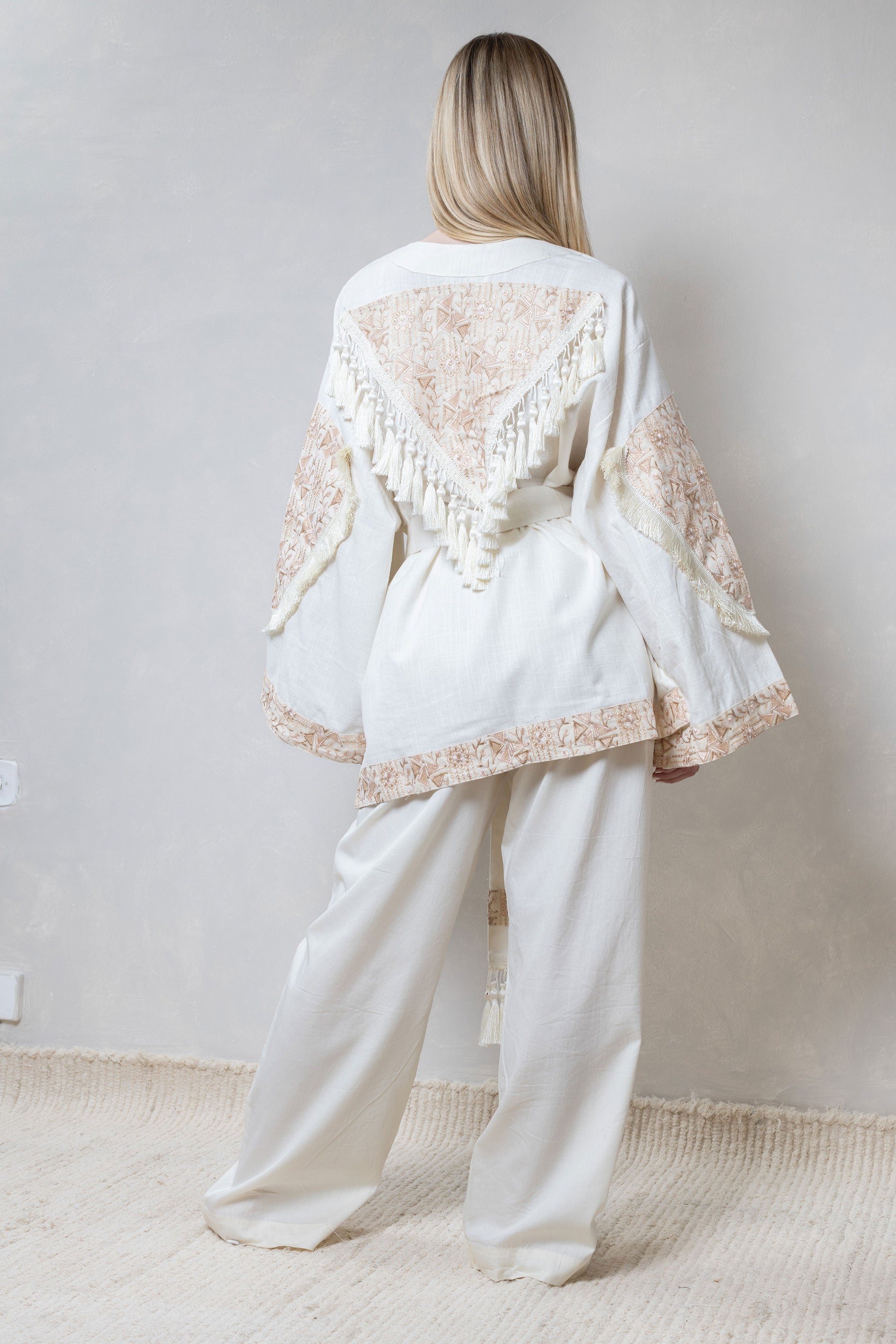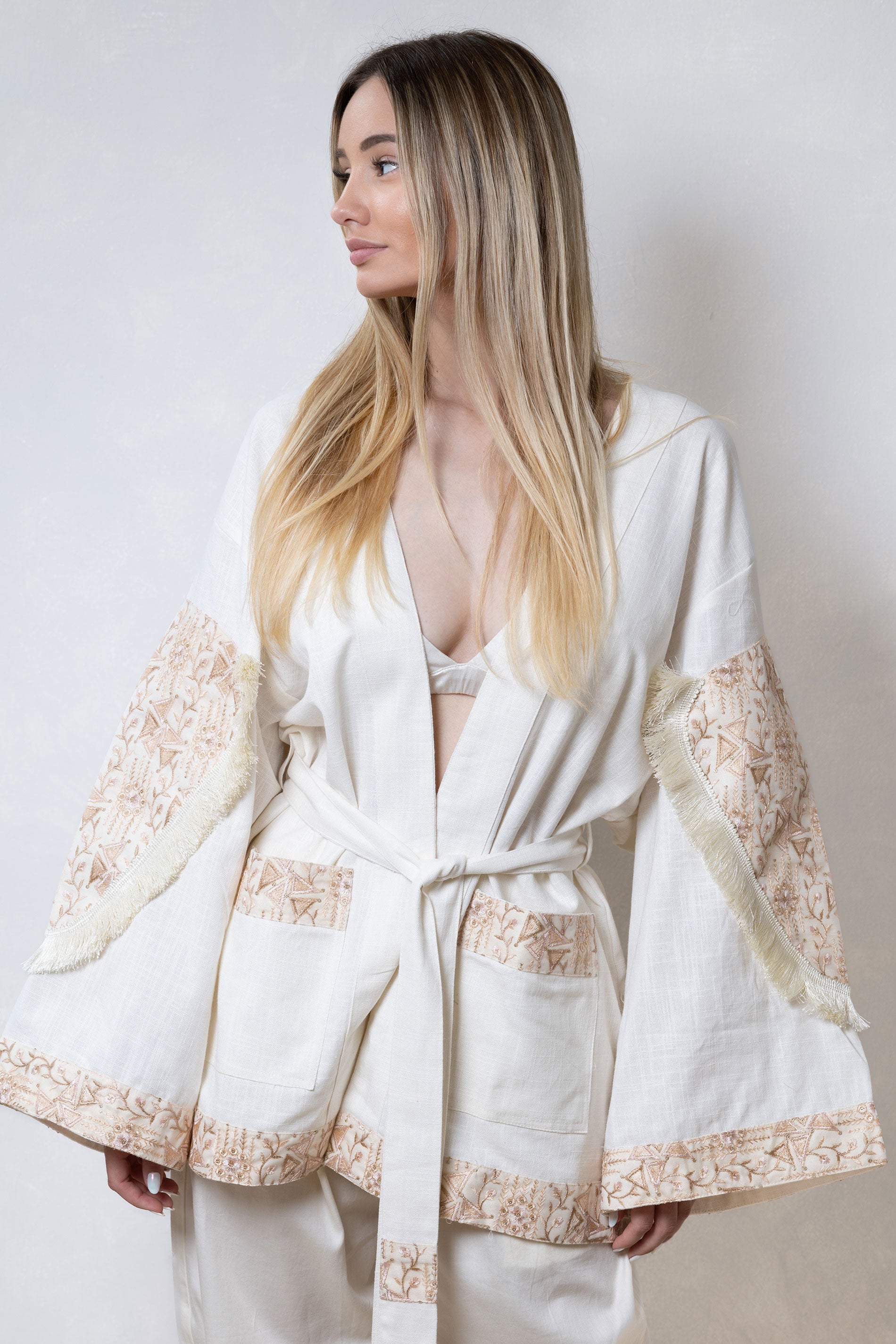 Kimono con Mangas y Cuello Cruzado Bajo. Fabricada en algodón 100% natural.