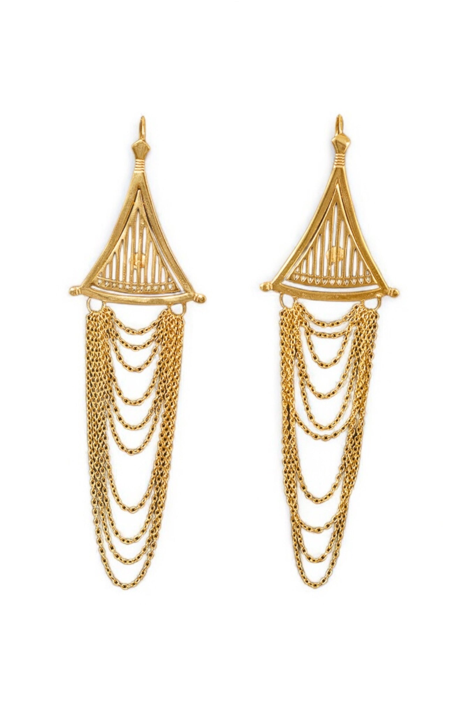 Con una estructura triangular delicadamente calada, estos pendientes hechos a mano en latón con baño de oro de 18 quilates combinan elegancia arquitectónica con movimiento fluido. Diez finas cadenas doradas cuelgan en forma de cascada, creando un efecto visual dinámico que se alarga de forma armónica de menor a mayor, aportando sofisticación y presencia a cualquier atuendo.