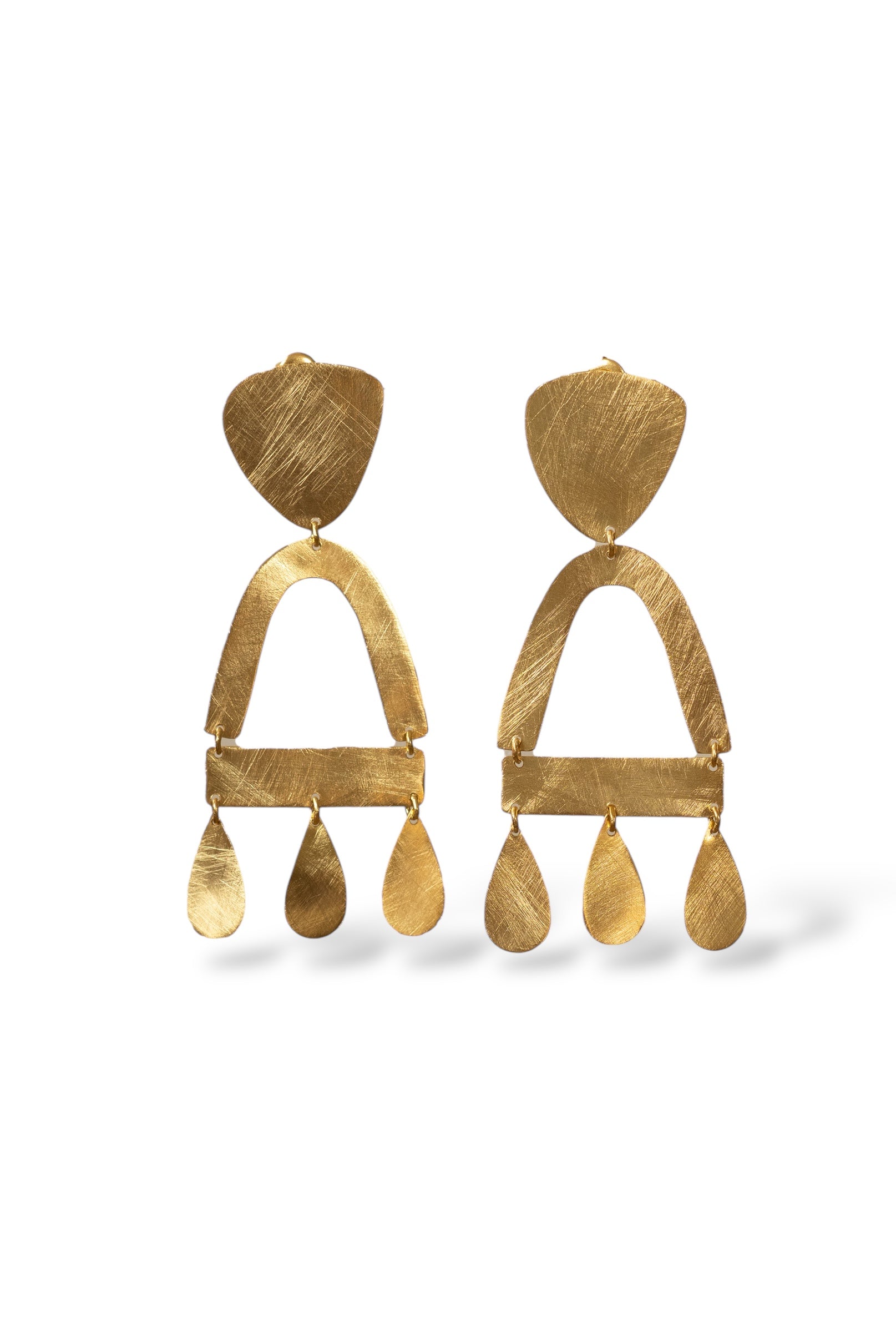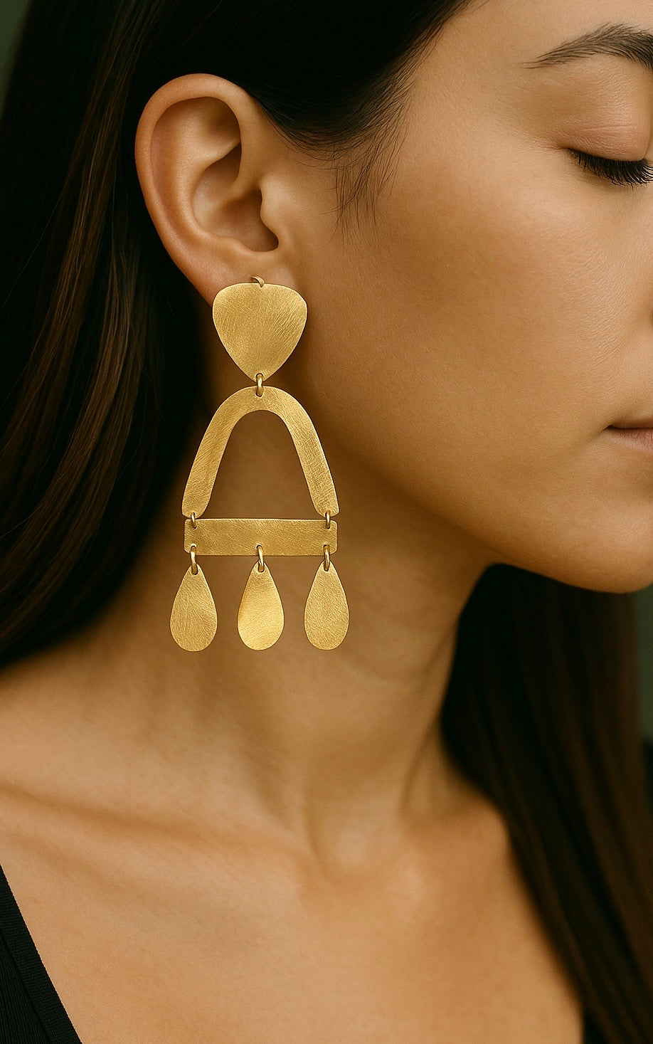 Estos llamativos pendientes están hechos a mano en latón con baño de oro de 18 quilates y destacan por su diseño arquitectónico, compuesto por formas orgánicas y líneas definidas que se articulan para crear una pieza única. Desde la parte superior en forma de corazón estilizado, hasta las gotas colgantes que añaden movimiento, cada elemento está pensado para capturar la atención sin sacrificar la elegancia.