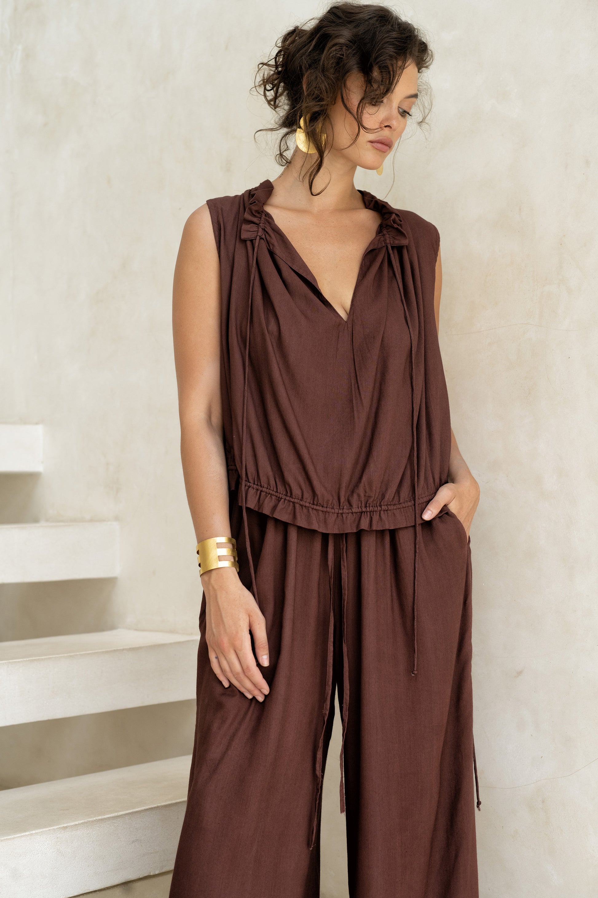 Diseño: Top sin mangas con cuello fruncido ajustable y escote en forma de V, que aporta un estilo elegante y desenfadado.