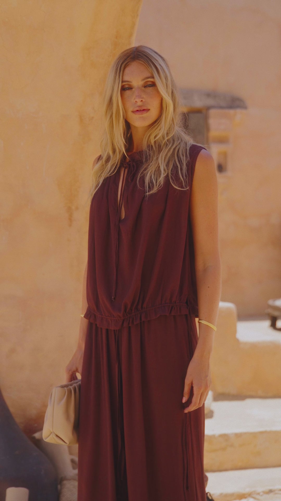 El top sin mangas Aurora, confeccionado en suave rayón modal, presenta un estilo elegante y suelto que realza la silueta femenina. Su diseño incluye un delicado cuello fruncido ajustable y un escote en forma de V, acompañado de hombros con detalle de manga corta. El dobladillo de corte cuadrado cae con gracia sobre las caderas, permitiendo también un ajuste ordenado al ser introducido en pantalones o faldas largas. Adicionalmente, el lazo enhebrado permite ser ajustado y atado, logrando un efecto de cintura con borde rizado que aporta versatilidad y un toque distintivo a tu look.