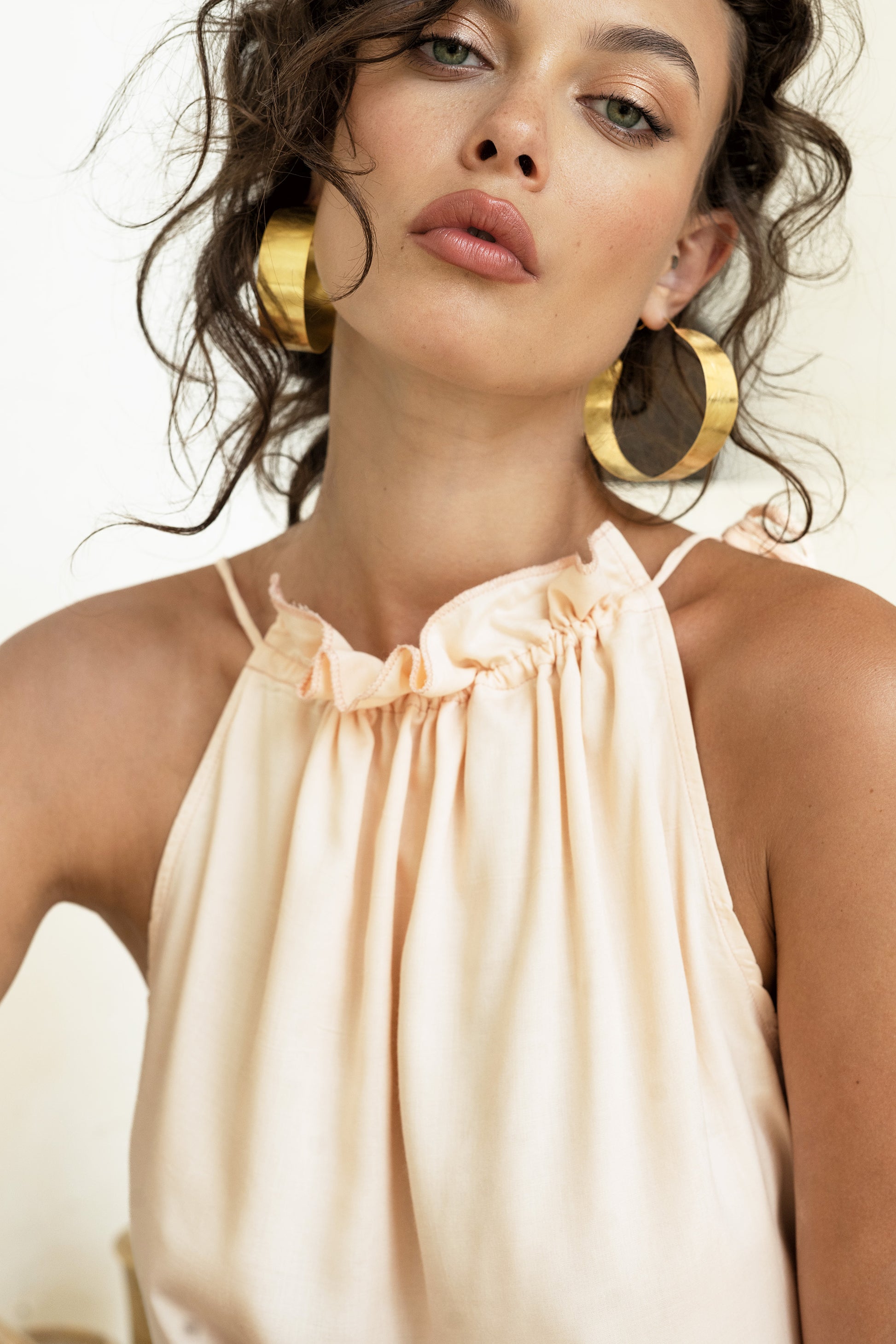 Diseño: Top halter ajustable con cuello fruncido alto y opción de escote barco para múltiples estilos.