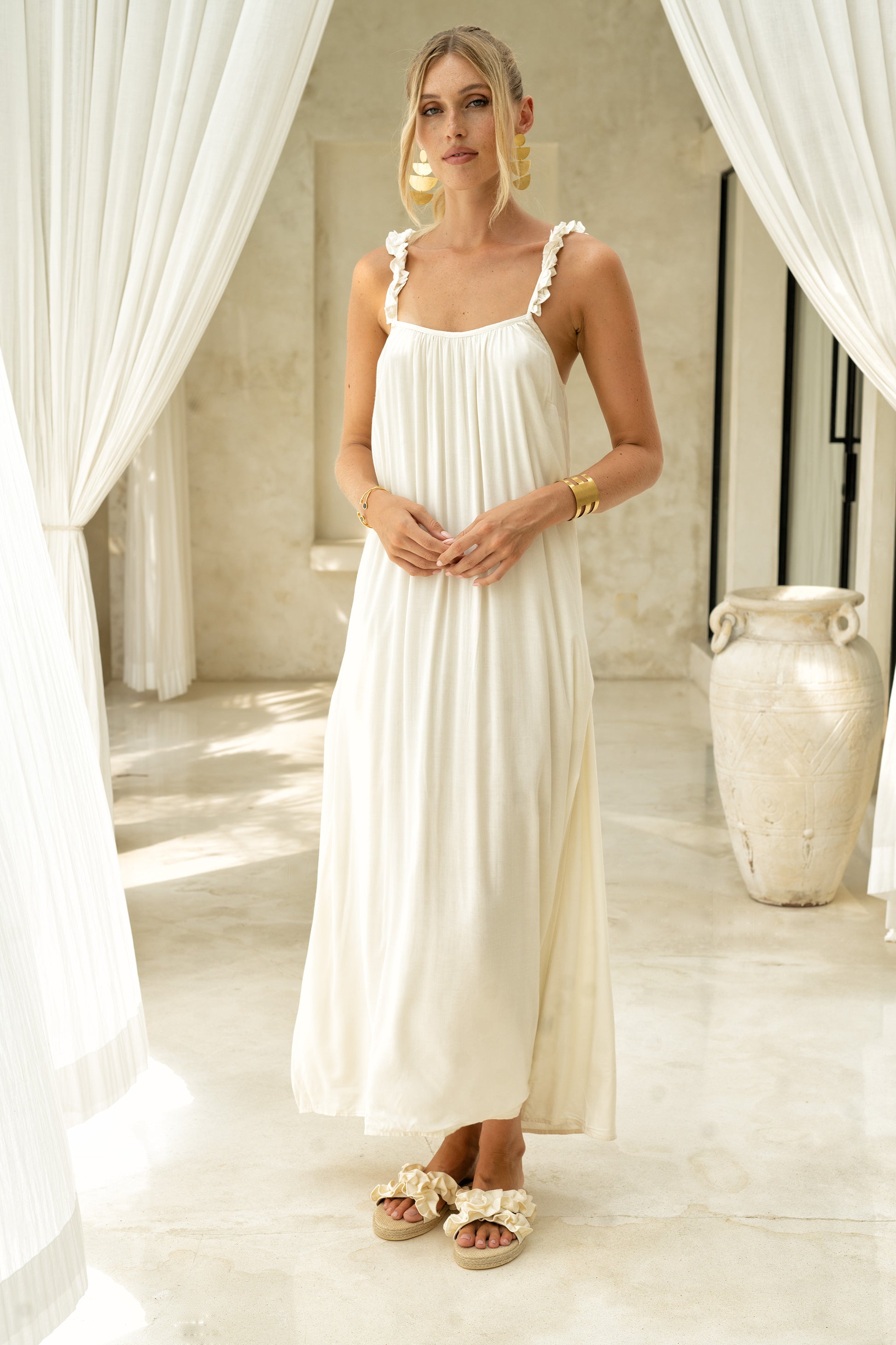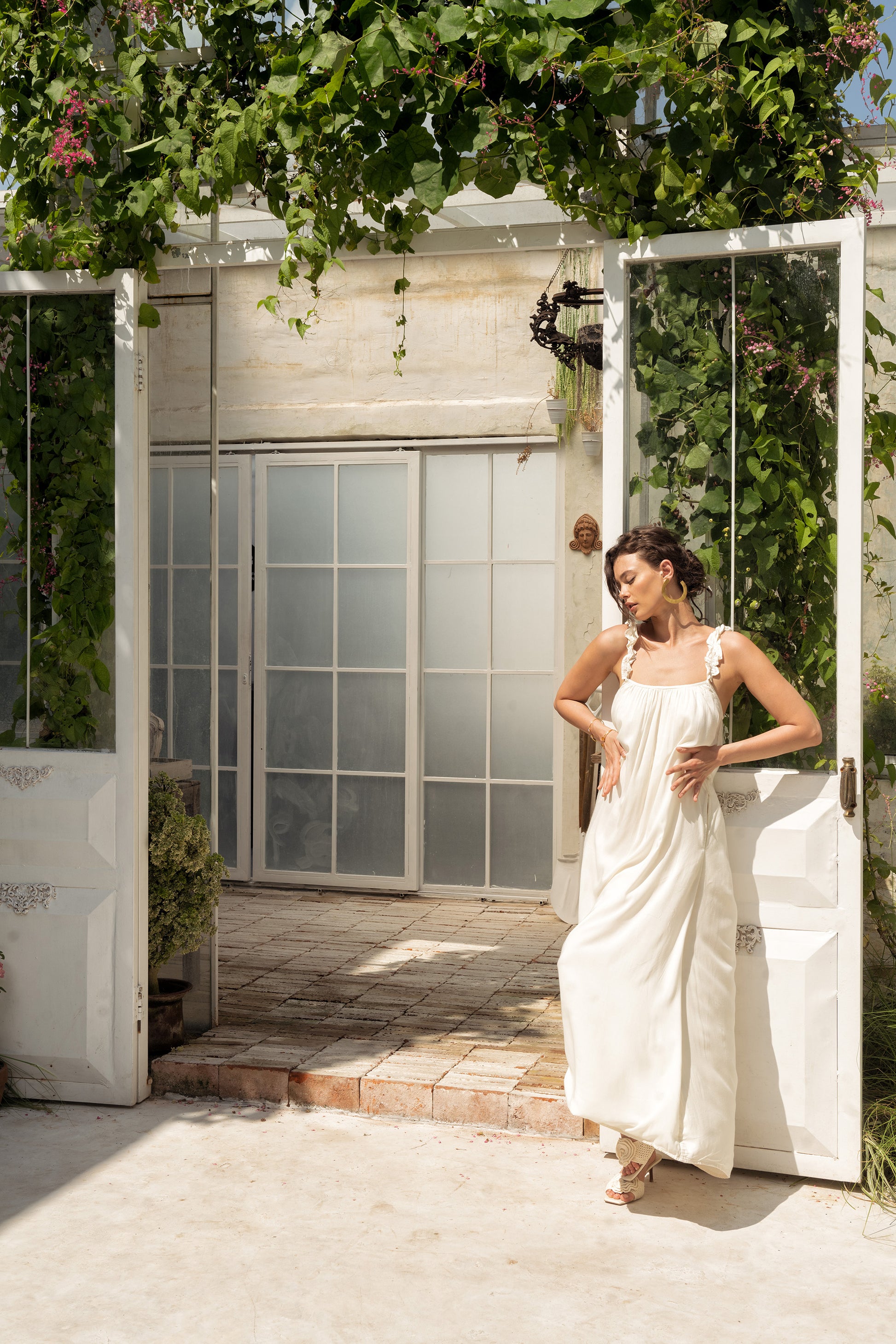 Diseño: Corte holgado con bolsillos, tirantes con volantes y una espalda con escote en forma de C que aporta un toque encantador. Incluye una goma elástica para máximo comfort.