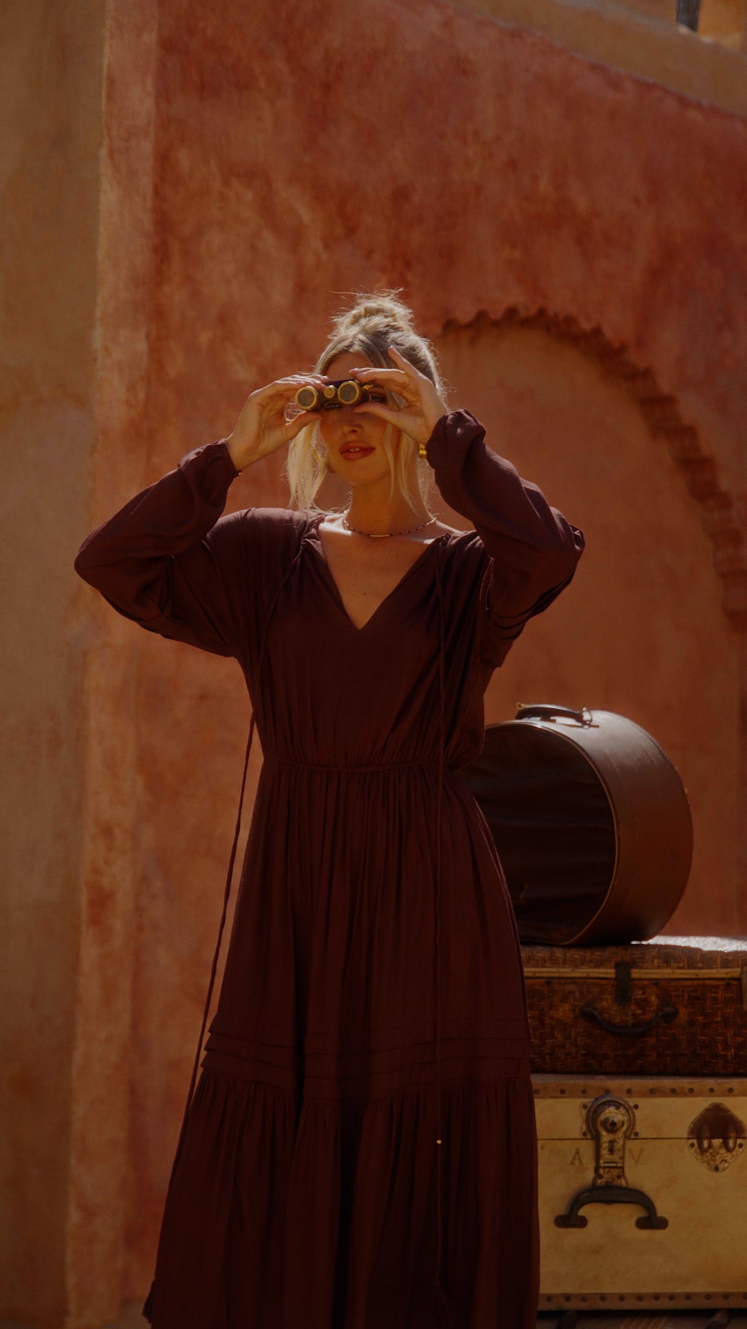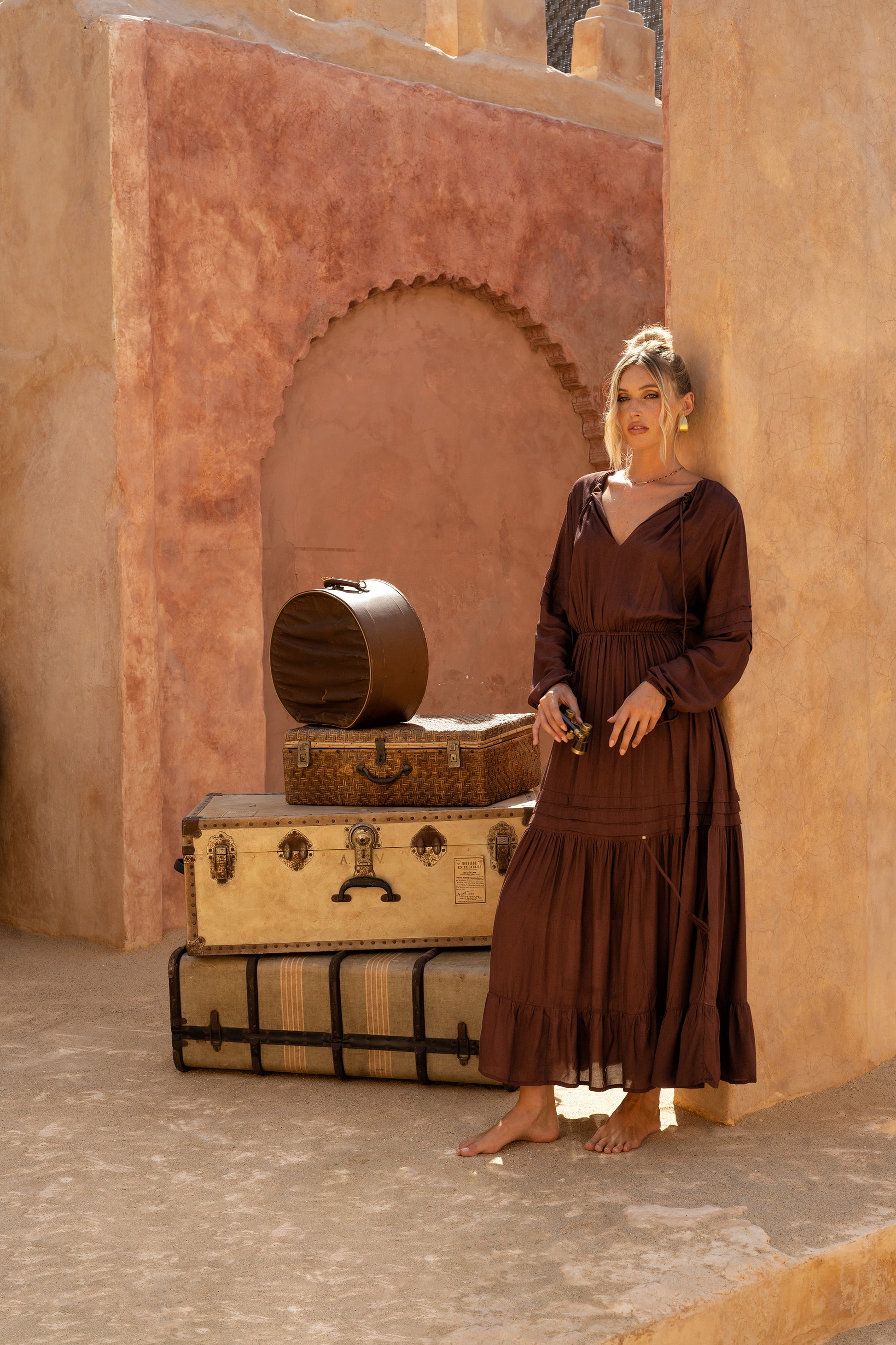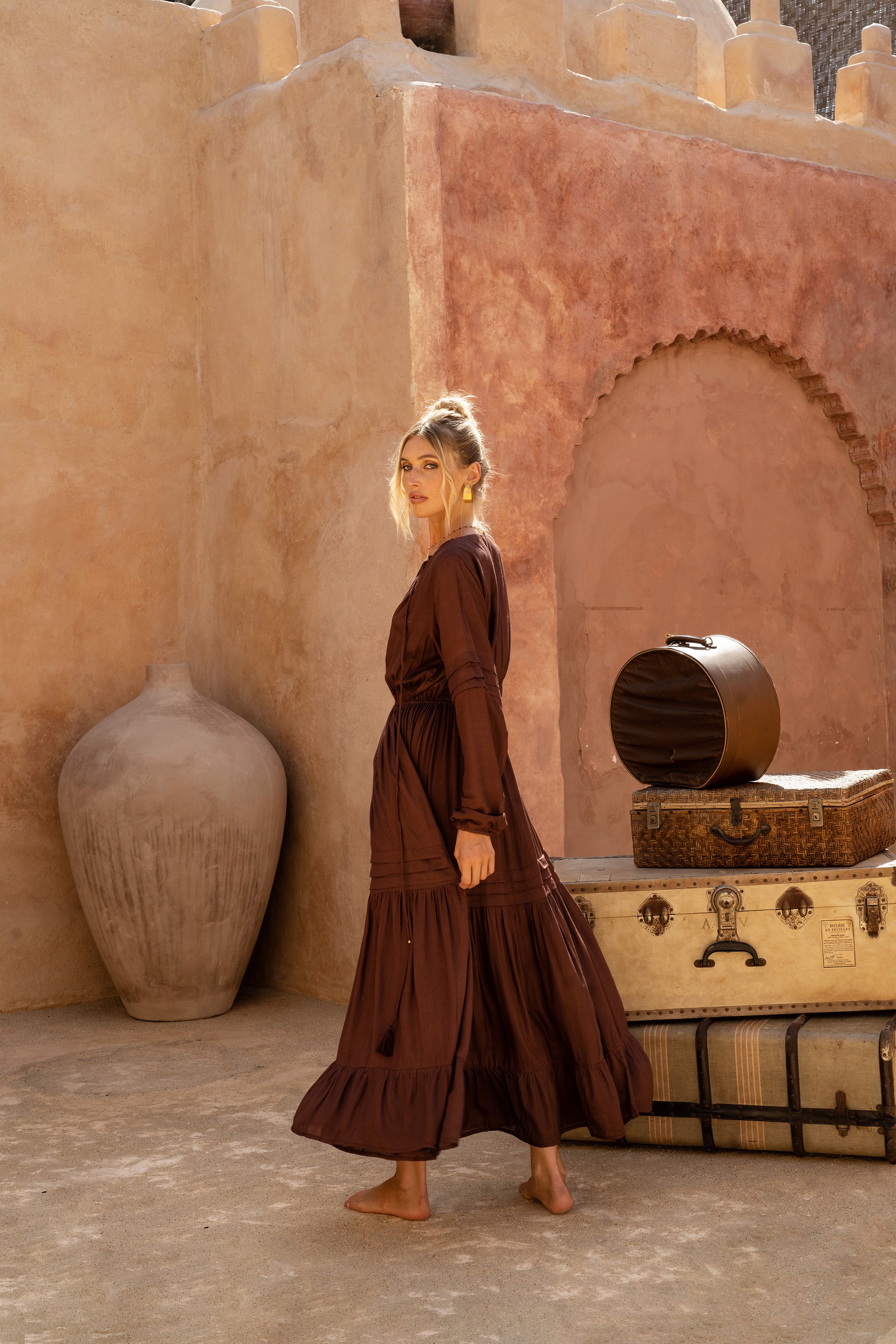 El vestido Violeta es la elección perfecta para ocasiones especiales donde desees lucir radiante y a la moda. Confeccionado en 9 metros de modal de alta calidad, su diseño asegura una suavidad y caído excepcionales. Diseñado con mangas largas, cuenta con una goma en los puños que permite ajustar la longitud de las mangas a 3/4 según tu preferencia. Las mangas destacan por un pliegue especial que añade un toque distintivo y sofisticado. En la cintura, una goma elástica se adapta cómodamente al contorno del cuerpo, complementada por un cordel estilo cinturón con flecos en las extremidades. La falda, en forma de campana, presenta una caída fluida y pliegues decorativos que aportan un aire chic y femenino al conjunto.