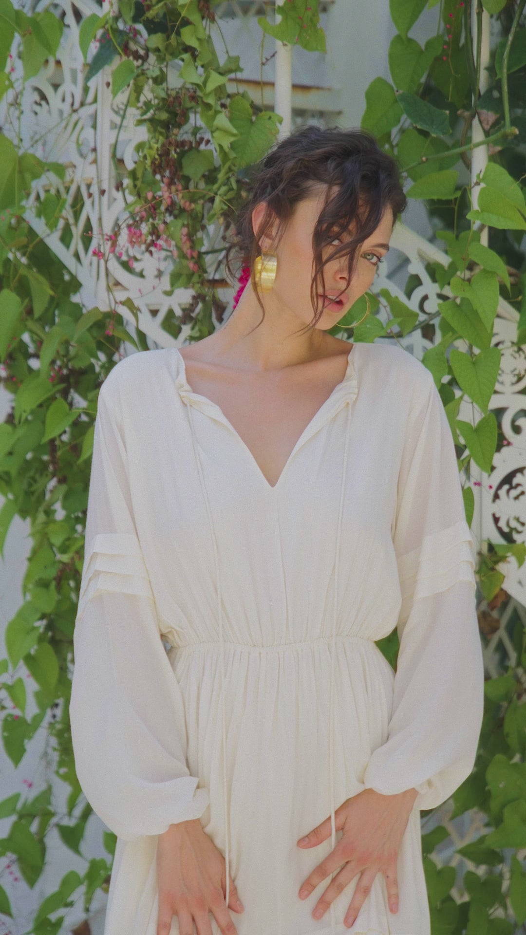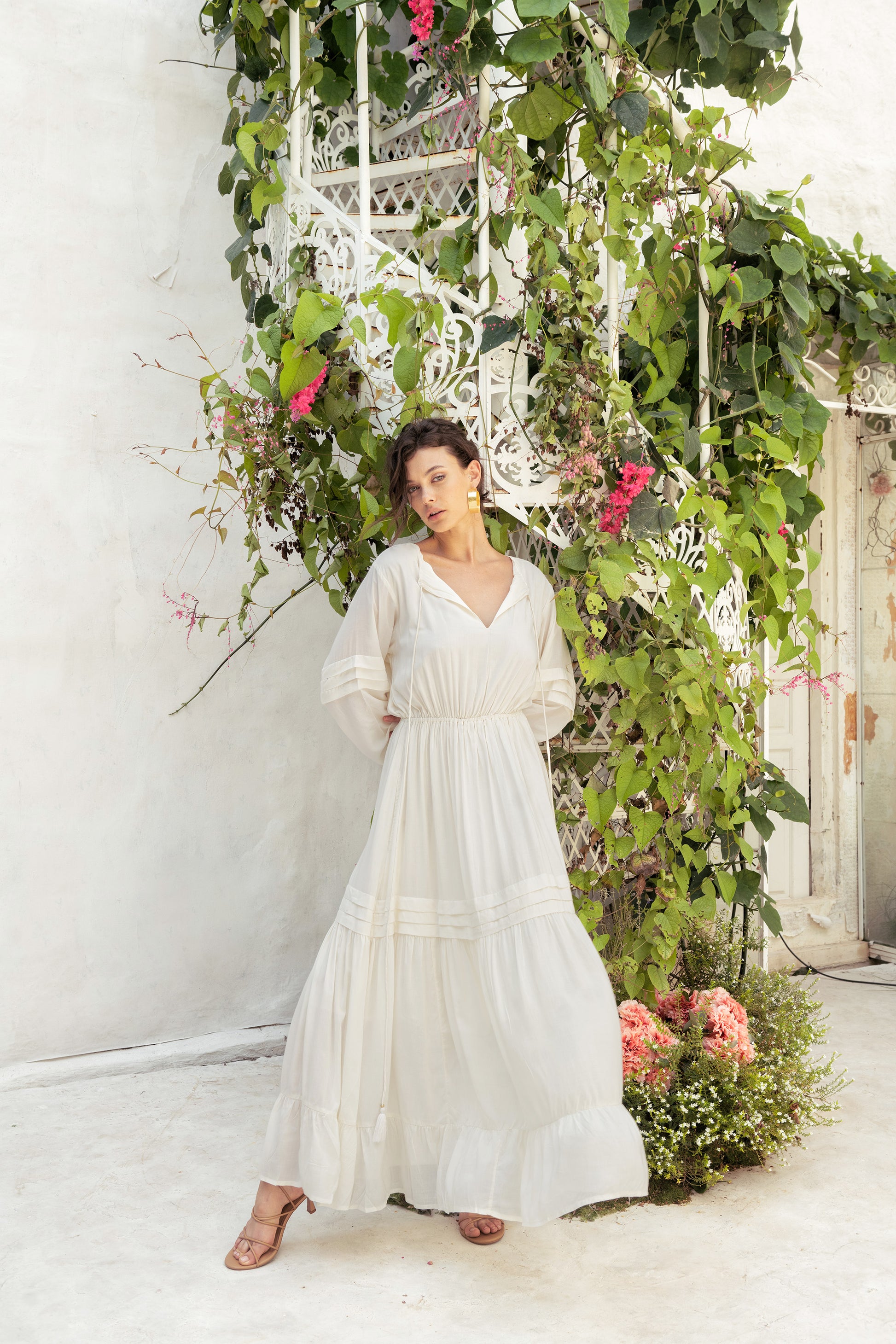 El vestido Violeta es la elección perfecta para ocasiones especiales donde desees lucir radiante y a la moda. Confeccionado en 9 metros de modal de alta calidad, su diseño asegura una suavidad y caído excepcionales. Diseñado con mangas largas, cuenta con una goma en los puños que permite ajustar la longitud de las mangas a 3/4 según tu preferencia. Las mangas destacan por un pliegue especial que añade un toque distintivo y sofisticado. En la cintura, una goma elástica se adapta cómodamente al contorno del cuerpo, complementada por un cordel estilo cinturón con flecos en las extremidades. La falda, en forma de campana, presenta una caída fluida y pliegues decorativos que aportan un aire chic y femenino al conjunto.